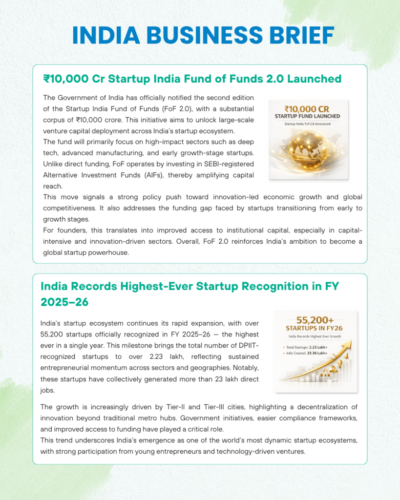📊 Major updates shaping India’s startup and MSME ecosystem this week — including the ₹10,000 Cr Startup India Fund of Funds 2.0, record-breaking startup growth, and key policy decisions impacting businesses.